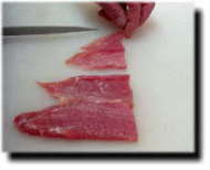 次に、包丁の背で軽く叩き肉の厚みを最終的に整えます